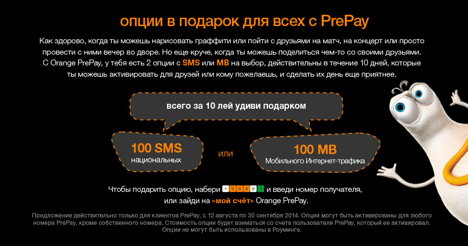 Лето заканчивается, но скоро развлечения продолжатся – уже в кругу школьных и университетских друзей, а также коллег по работе. С новыми опциями от PrePay у тебя есть возможность делиться с друзьями мегабайтами или SMS, на выбор, и разукрасить свои будни. Всего за 10 лей, ты можешь активировать 100 SMS или 100 MB, на выбор, для своих друзей или для кого пожелаешь, и сделать их день еще интереснее. Опции действуют 10 дней с момента активации. Чтобы подарить опцию, набери *544# и введи номер получателя.