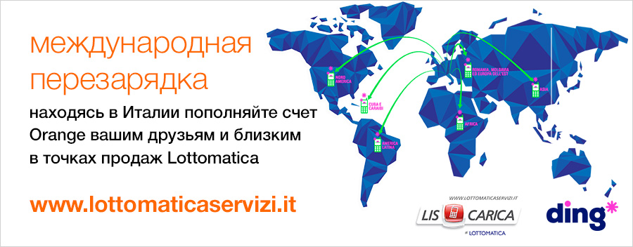 Если у Вас есть родственники или друзья в Италии и Вы часто путешествуйте в стране да Винчи, мы даем Вам возможность пополнить счет Orange непосредственно на территории Италии в точках продаж Lottomatica. Lottomatica является одним из крупнейших операторов лотерей в мире и является лидером в Италии в игровой индустрии. Игровые автоматы Lottomatica можно найти в Италии где Вам угодно - в кафе, табачных киосках и на автозаправочных станциях. Эти пункты легко узнаваемы, потому что Lottomatica единственный поставщик государственных лотерей в Италии. Найдите полный список операторов и ближайшую точку продажи на www.lottomaticaservizi.it. Пополняйте и общайтесь легко, даже если Вы далеко от дома!