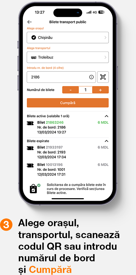 Toți clienții Orange care au un număr mobil activ pot achita călătoria în troleibuze și autobuze cu telefonul mobil, fără comision sau plăți adiționale. Poți cumpăra biletul prin aplicația My Orange sau prin SMS. Alege metoda cea mai comodă pentru tine și călătorește fără griji.