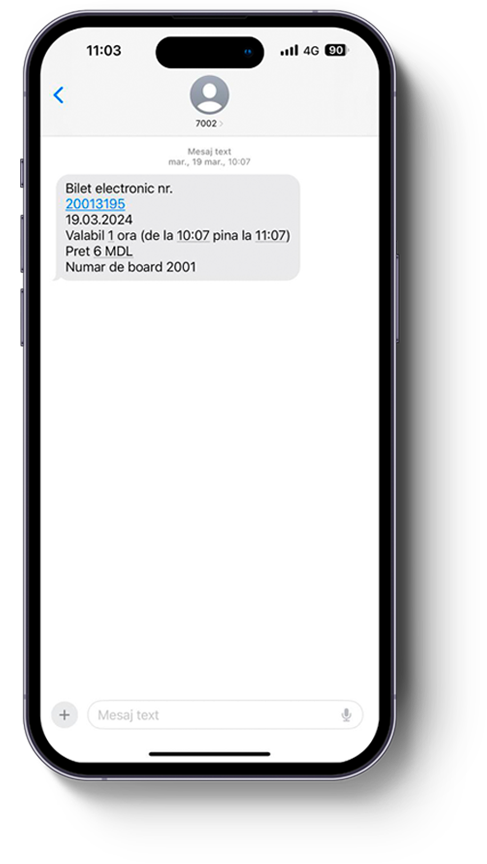 Dacă optezi pentru achitarea biletului prin SMS, e necesar doar să expediezi un mesaj la numărul scurt afișat în mijlocul de transport.