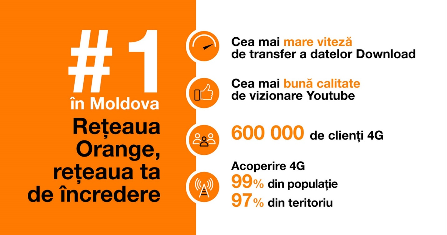 Pentru a oferi tuturor acces egal la tehnologie, ne concentrăm pe îmbunătățirea acoperirii rețelei noastre. Orange Moldova a fost certificată în mod repetat drept cea mai de calitate rețea mobilă, atât în servicii voce, cât și Internet. Aceasta deservește peste 2 milioane 600 mii de clienți și oferă servicii voce și Internet mobil, televiziune și Internet fix prin conexiune 100% Fibră, cu super viteză de până la 1 Gbps.