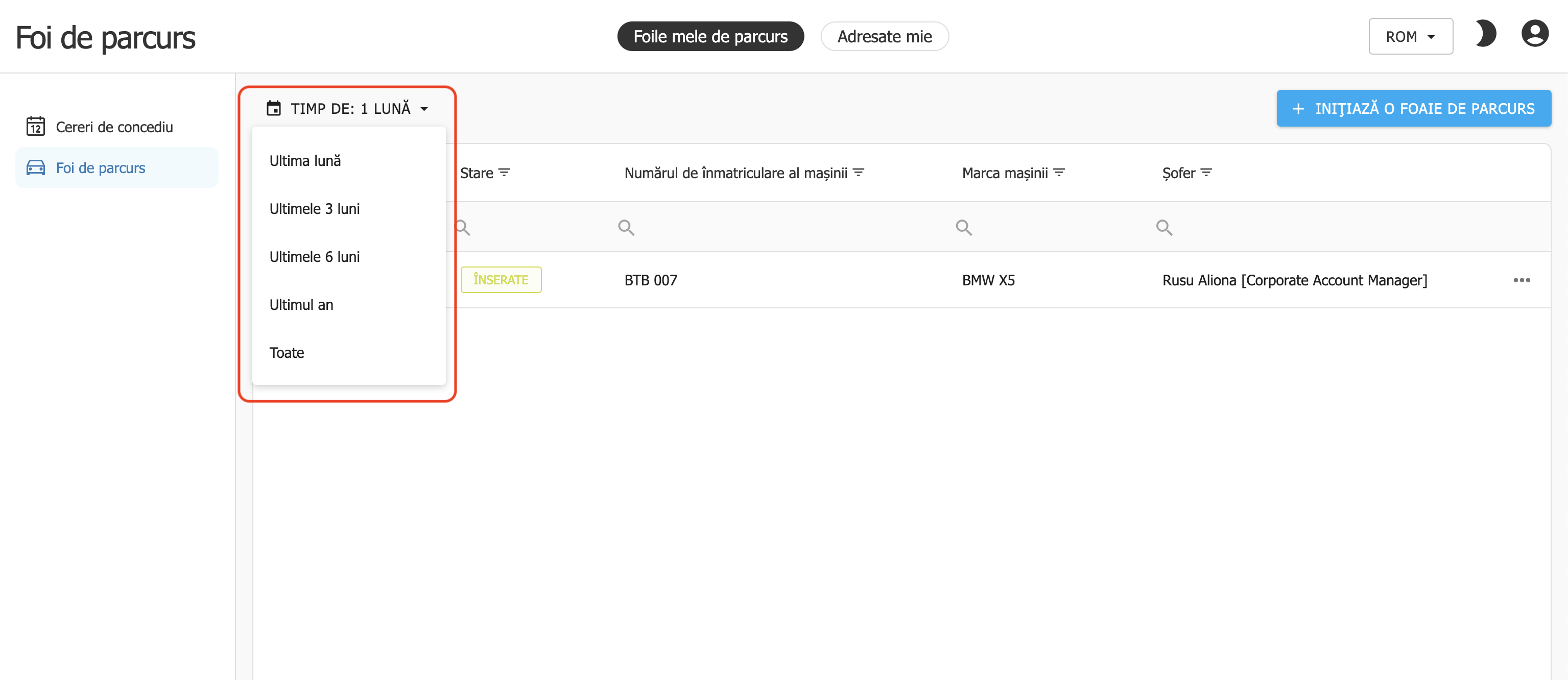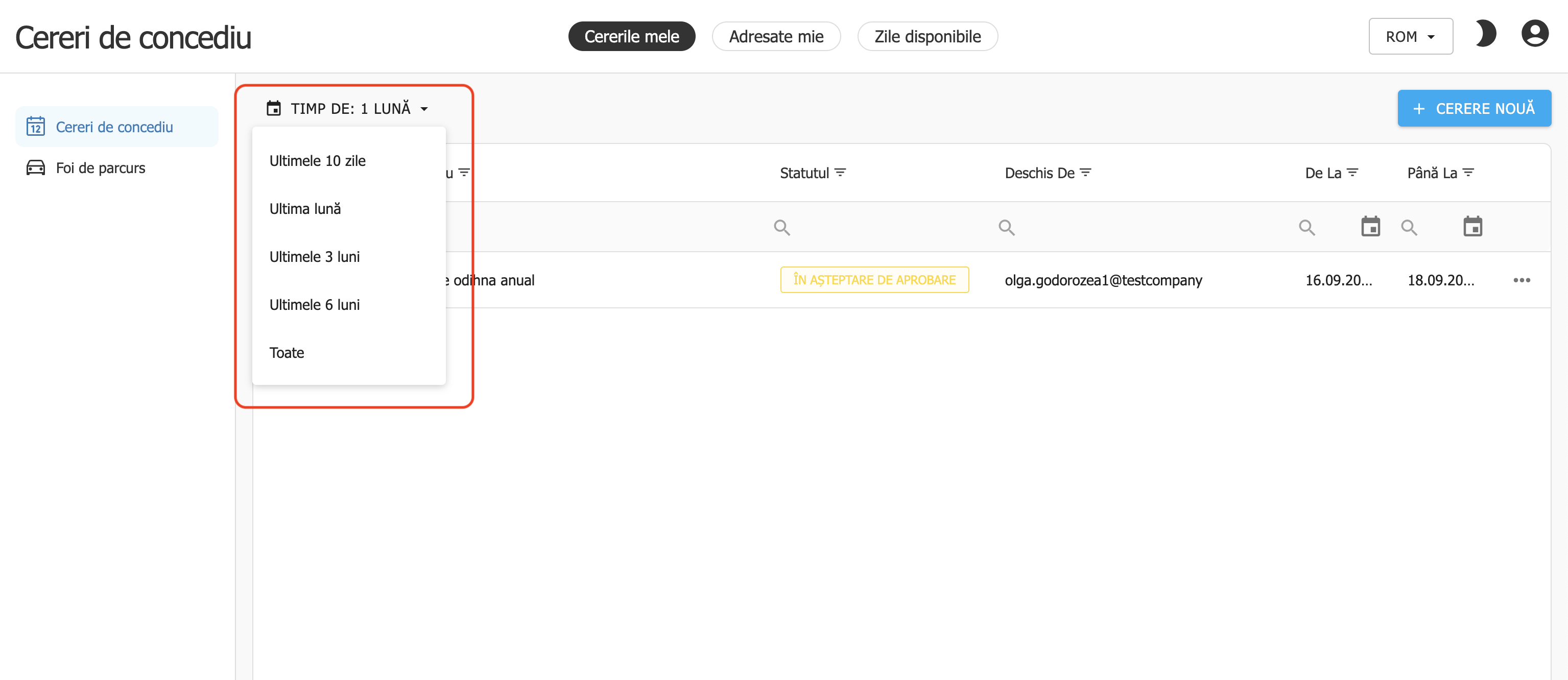 În colțul stâng poți vizualiza arhiva cererilor de concediu