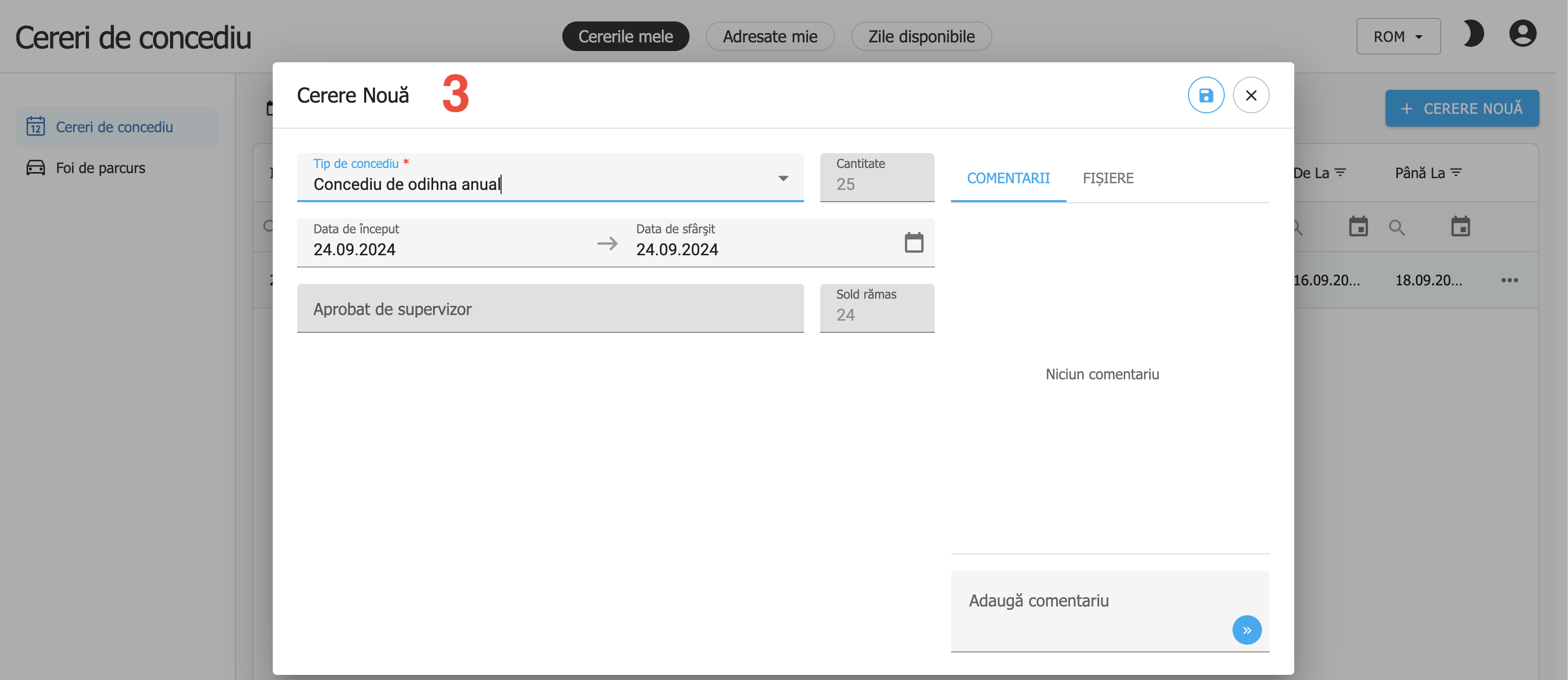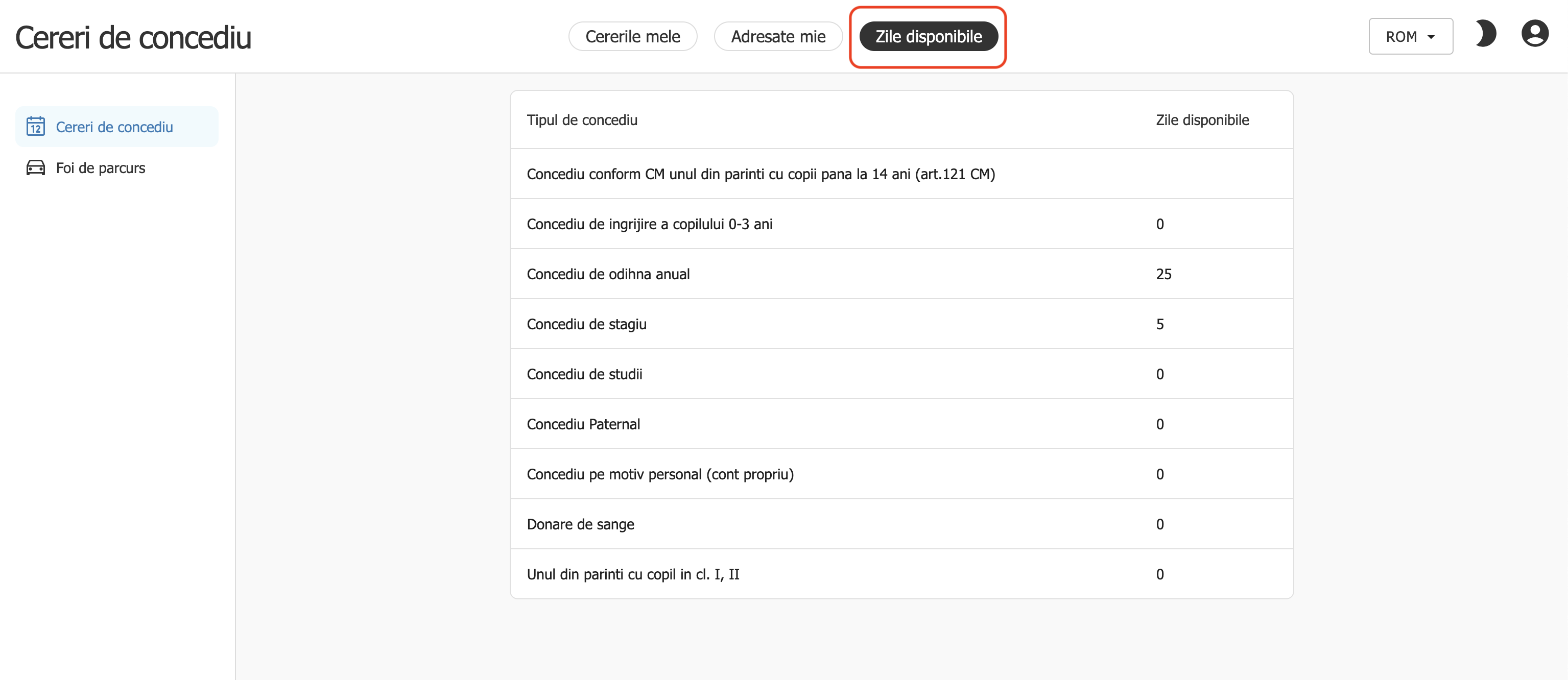 În secțiunea „Zile disponibile” vei vizualiza numărul zilelor de concediu rămase