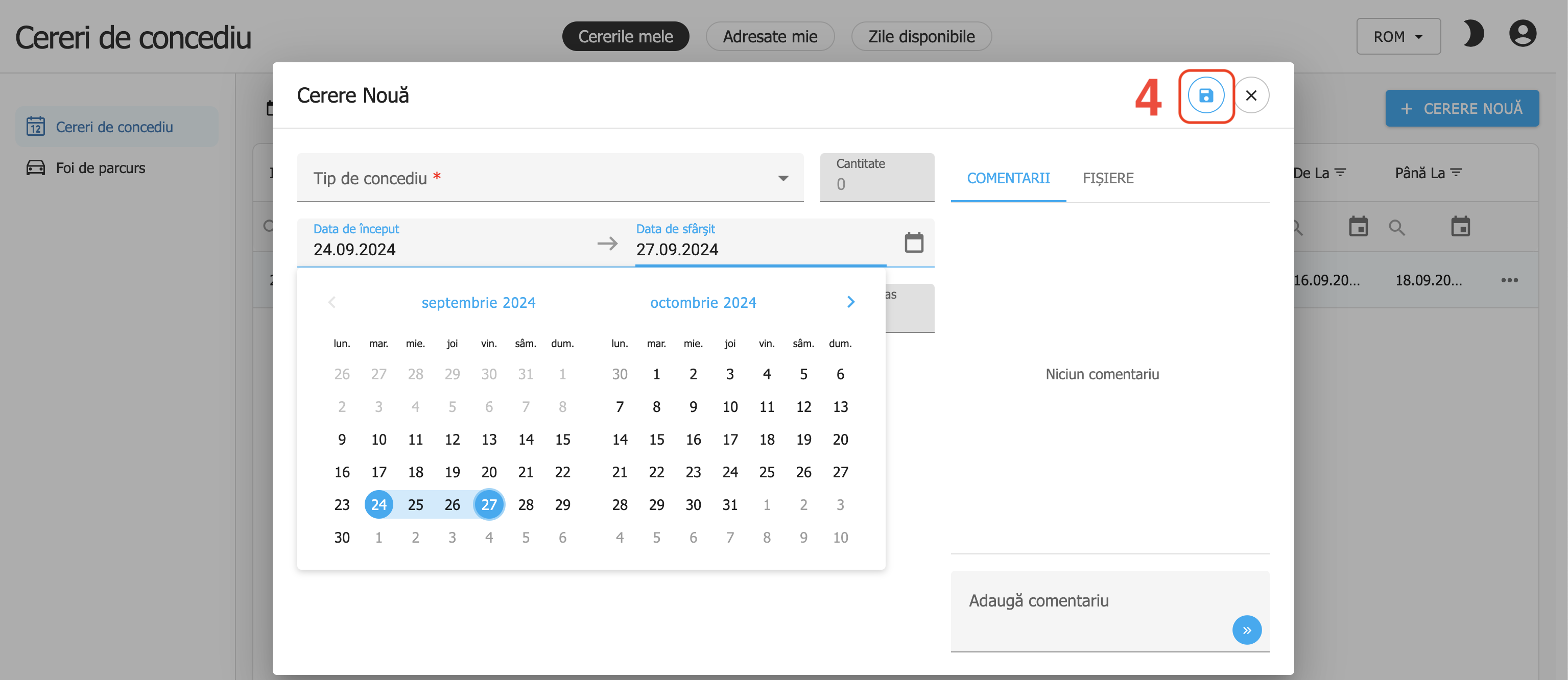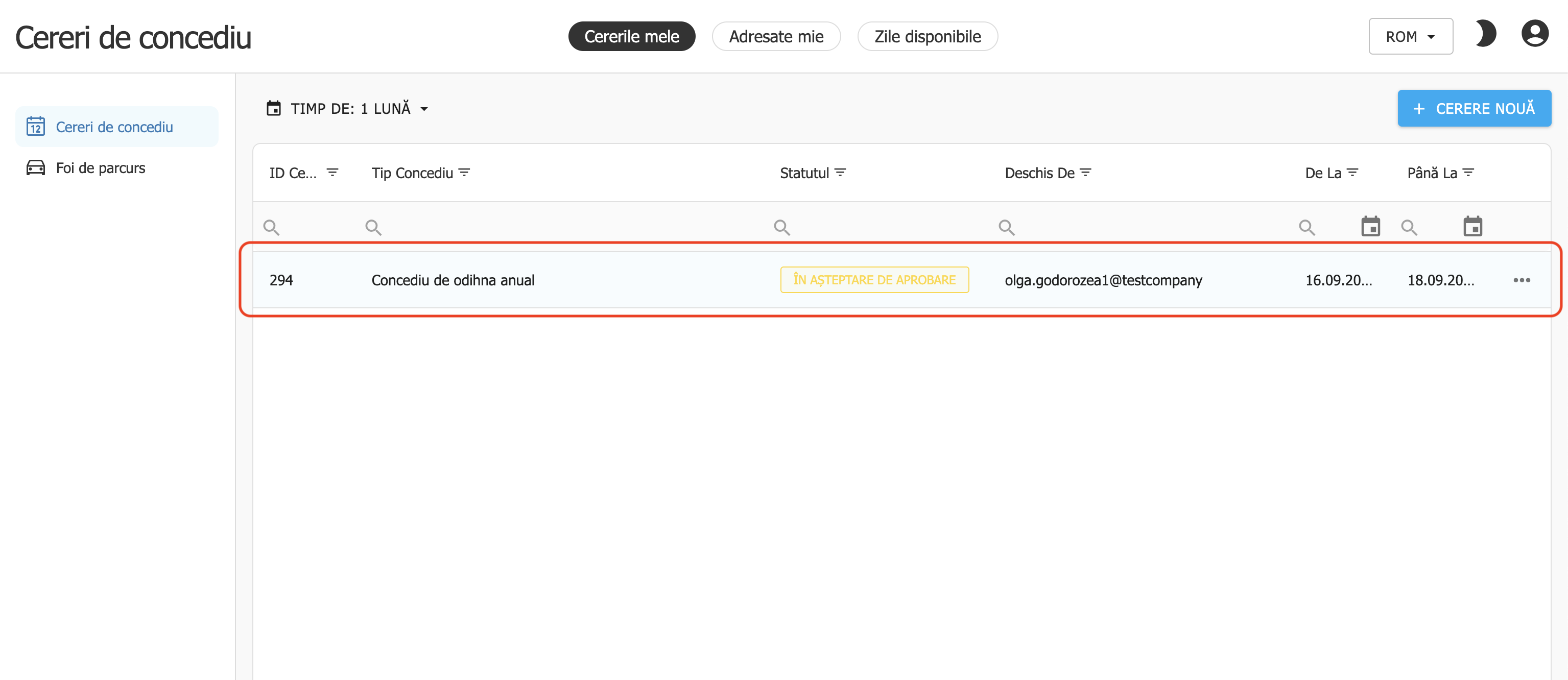 1. Din interfața aplicației, selectează „Cereri de concediu”