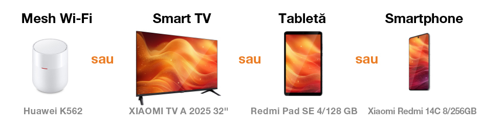 - Oferta „Dispozitiv la preț special” este disponibilă consumatorilor casnici care dețin un abonament mobil voce Orange activ cu plata lunară de cel puțin 70 lei şi se conectează la un abonament Fibra + TV START, Fibră + TV OPTIM, Fibră + TV ULTRA, Fibră + TV ULTRA FTTR sau Fibră + TV INFINITY (abonamente fixe eligibile).