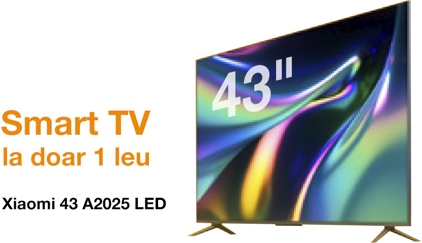 - 1 leu pentru Smart TV 43" Xiaomi QLED TV A Pro 43" sau Xiaomi 43 A2025 LED - la conectarea abonamentului Fibră + TV ULTRA (350 lei) sau Fibra + TV ULTRA FTTR (500 lei)