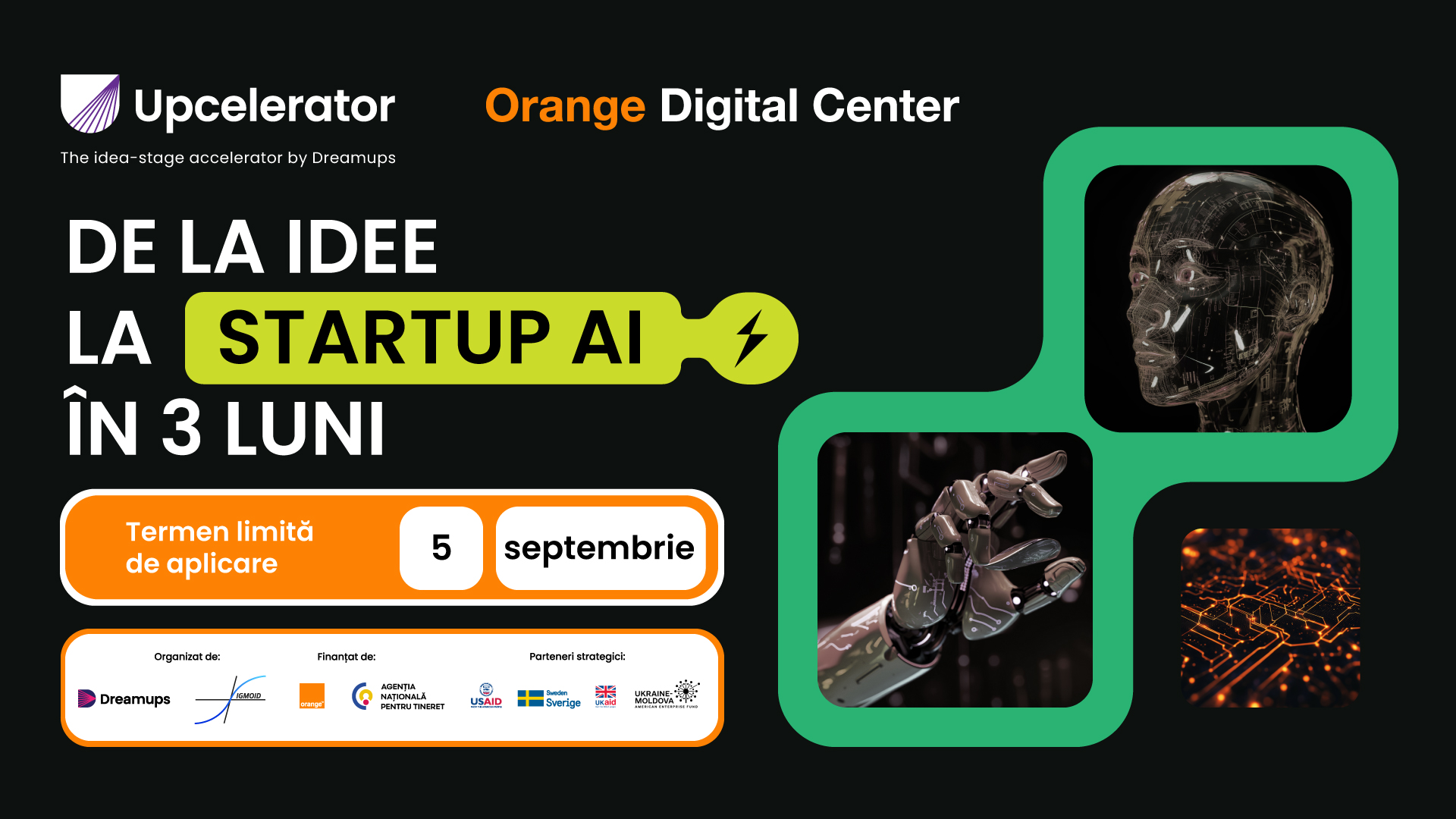 Ediția dată a programului Upcelerator by Dreamups, realizată în colaborare cu Orange Digital Center și Sigmoid, oferă tinerilor antreprenori tech șansa de a dezvolta soluții bazate pe inteligența artificială timp de 3 luni, fără costuri. Participanții vor avea, de asemenea, acces și suport în Machine Learning și Inteligență Artificială, pentru a construi MVP-uri funcționale și a transforma ideile inovatoare în realitate.