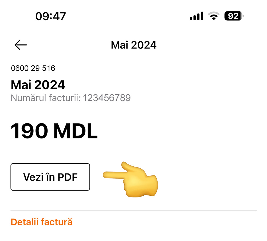 Noua versiune a aplicației My Orange îți permite să vezi și să descarci factura lunară Orange în format PDF. Comod de vizualizat, dar și de păstrat. Este exact factura Orange pe care o primești prin email, cu toate serviciile și numerele tale Orange, nu doar pentru numărul cu care te-ai logat. Pentru a descărca ultima factură lunară, loghează-te în My Orange, apoi intră la secțiunea Factura de pe pagina principală.