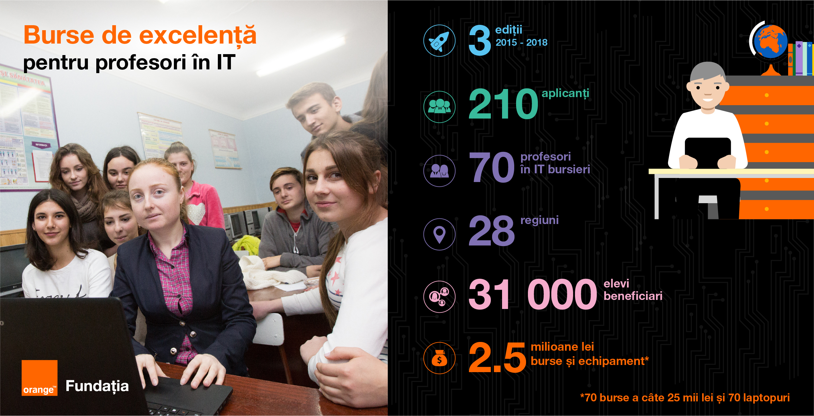 Proiectul Burse de Excelență pentru profesori în IT a fost lansat în 2015 ca parte componentă a proiectului Fundaţiei Orange de susţinere a educaţiei digitale din Moldova - Orange Digital School. Sub umbrela acestuia sunt implementate câteva proiecte majore, care vin să asigure în învăţământul din ţara noastră accesul la infrastructură modernă, expertiză profesională şi educaţie de calitate în domeniul tehnologiilor informaţionale. Prin intermediul „Burse de excelenţă pentru profesori în IT”, Fundaţia Orange şi-a propus să încurajeze şi să promoveze angajarea profesorilor de informatică în instituţii de învăţământ din Moldova, unde se înregistrează o lipsă acută de cadre didactice.