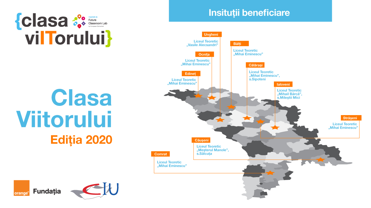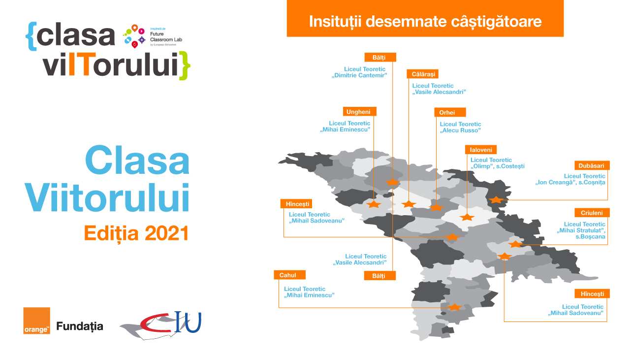 Fundația Orange Moldova anunță rezultatele ediției 2020 ale proiectului “Clasa Viitorului”, astfel, 10 școli din nouă regiuni ale țării au devenit parte a proiectului. În această ediție, 7 625 de elevi și 513 profesori au beneficiat de echipament digital performant, mobilier modern și elemente de decor specifice proiectului, servicii gratuite și consultanță în design, inclusiv cursuri de formare profesională continuă, datorită suportului financiar integral al Fundației Orange Moldova.