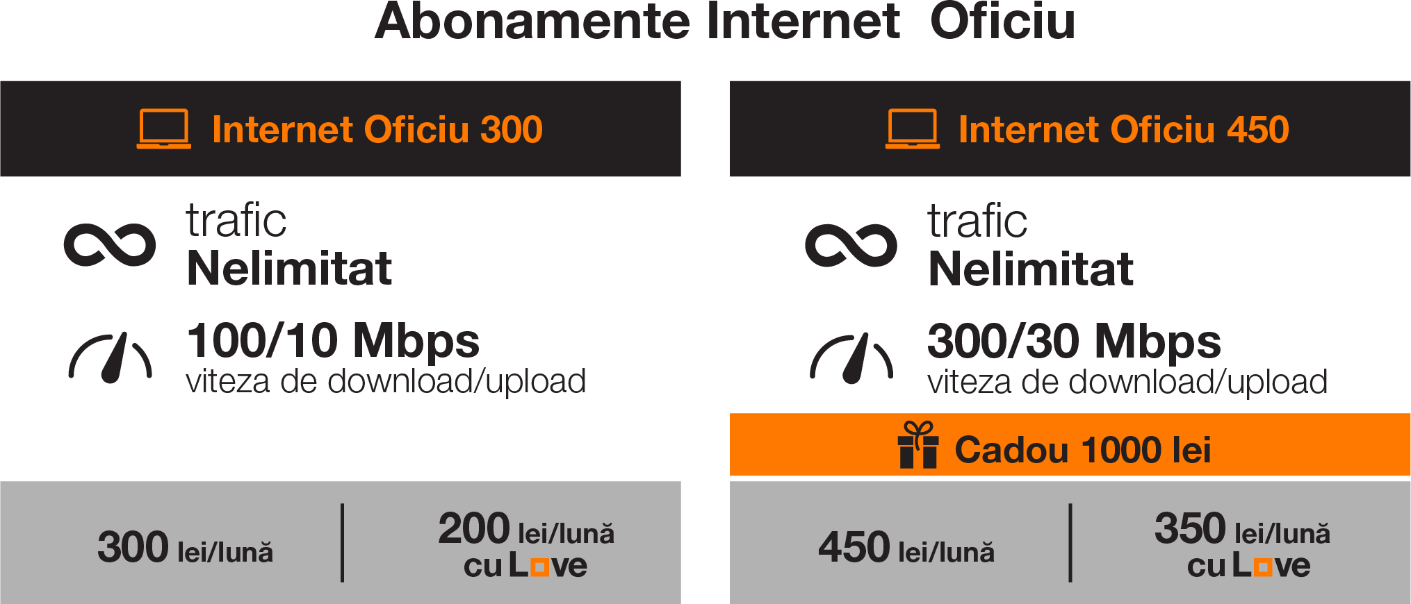 La combinarea abonamentului mobil cu unul dintre cele două abonamente Internet Oficiu, clientul beneficiază de o reducere de 100 de lei/lunar pe viață. Pentru cei care aleg abonamentul Internet Oficiu 450, Orange oferă 1000 de lei bonus pentru procurarea dispozitivelor necesare afacerii.