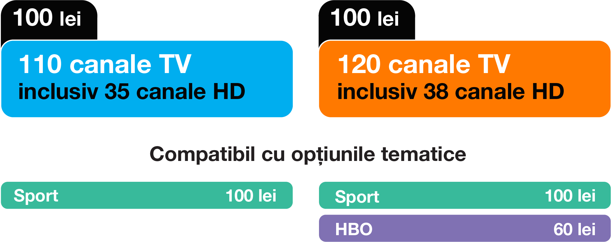 - Abonament TV Oficiu - potrivit pentru spaţii private, oficii, camere de hotel, săli de conferinţe etc. Abonamentul oferă 120 de canale TV, inclusiv 38 canale HD şi este compatibil cu opţiunea Sport la preţ de 100 lei şi opţiunea HBO la 60 de lei. Opţiunea HBO oferă acces la cele mai tari filme și seriale de top, pe 5 canale TV din familia HBO, CINEMAX HD şi CINEMAX 2 HD.