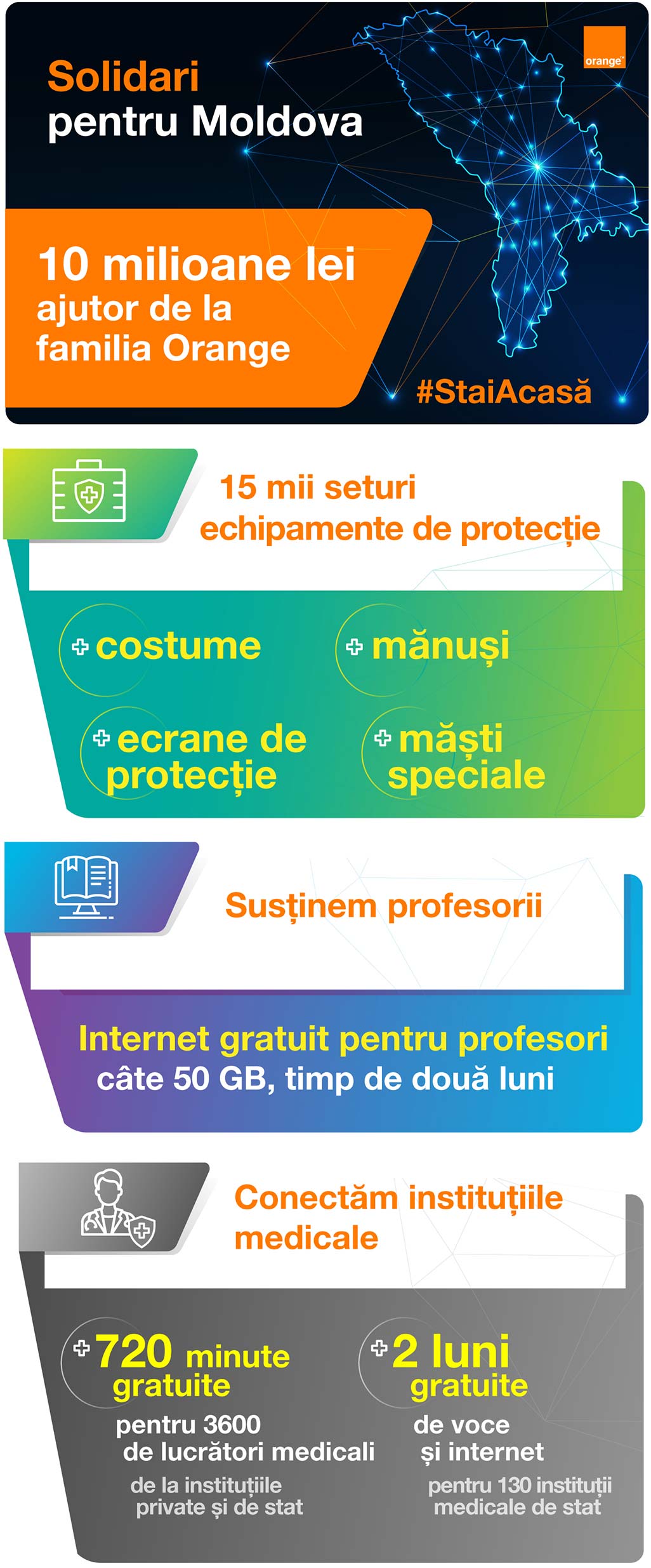 Orange Moldova este solidară cu eforturile depuse de către autorități şi societate şi se implică cu maximă responsabilitate față de angajaţi, clienți, mediul de afaceri, sistemul medical şi cel al educaţiei pentru a depăşi această pandemie globală.