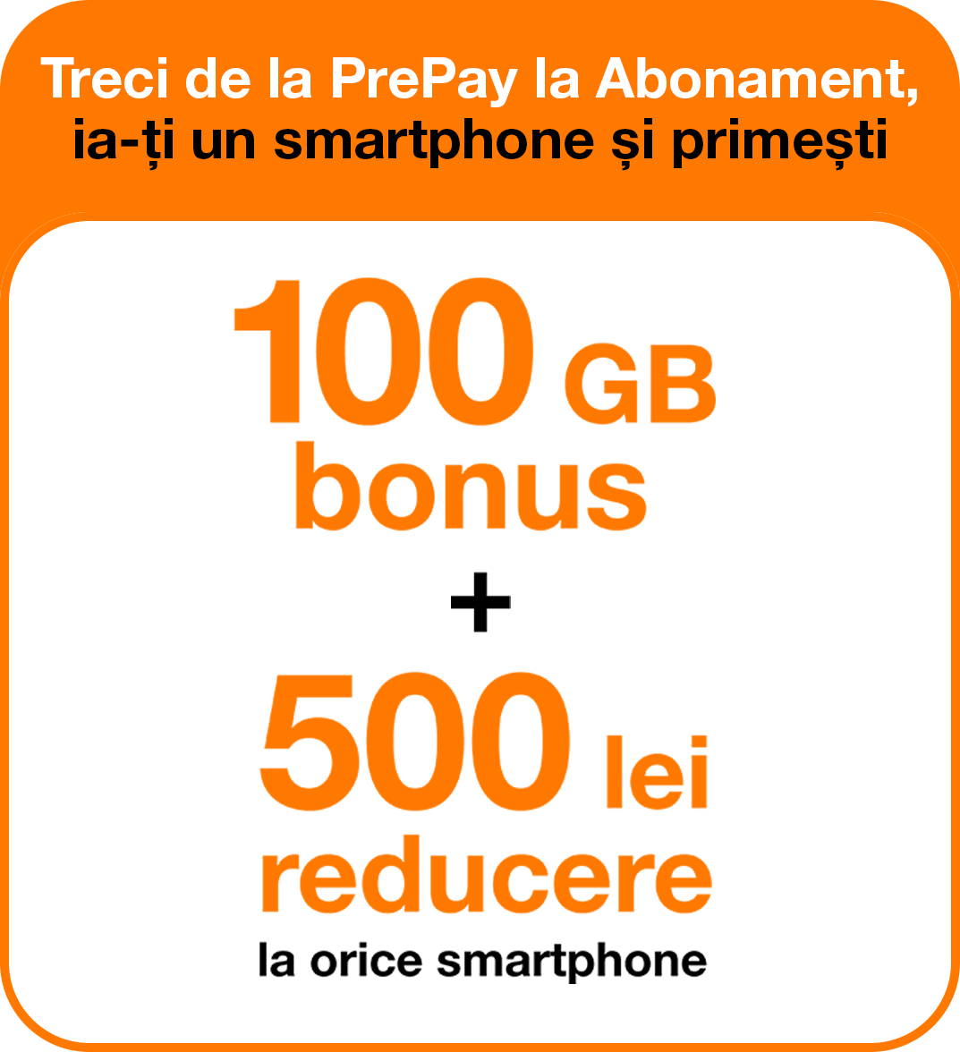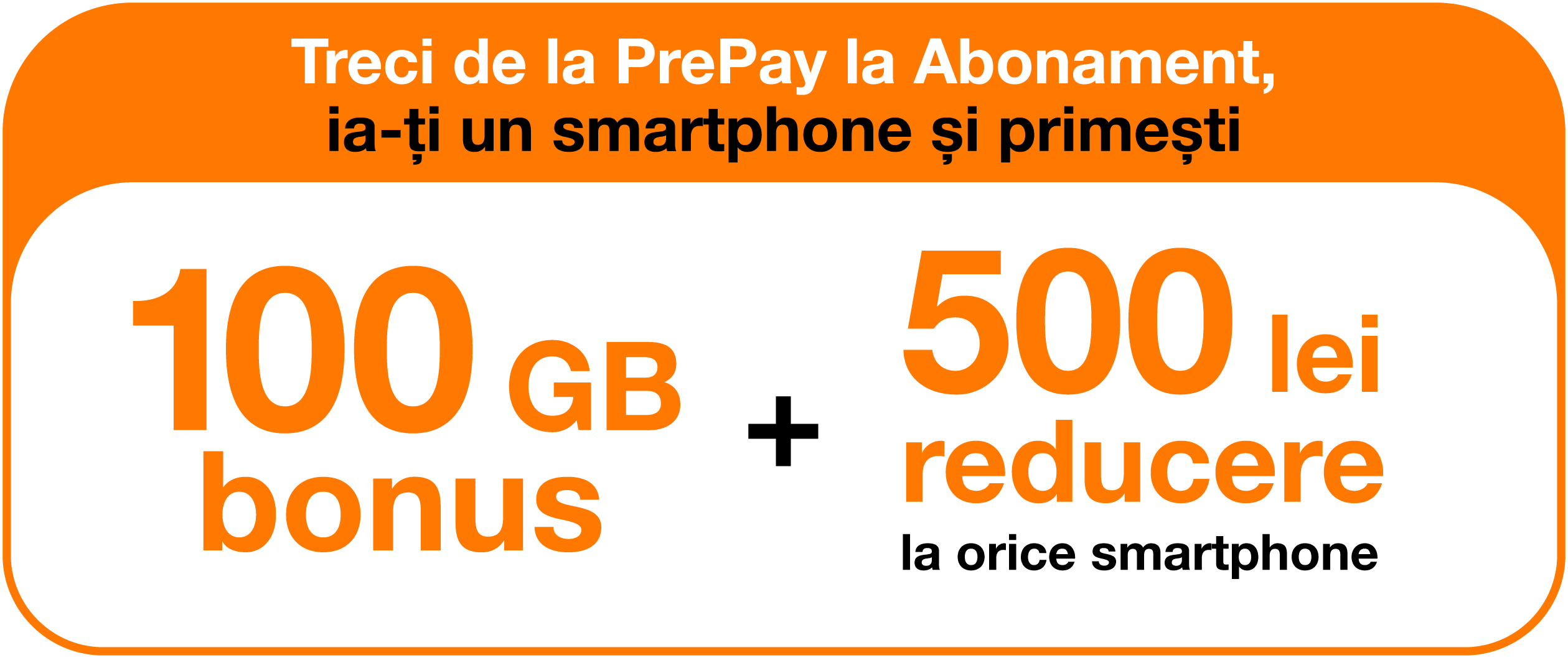 Vara asta faci un pas înainte și ai parte de surprize plăcute de la Orange. Treci de la PrePay la Abonament, cumpără un smartphone de la Orange și prinde super-oferta – 500 lei reducere pentru telefonul ales și 100 GB bonus pentru jumătate de an.