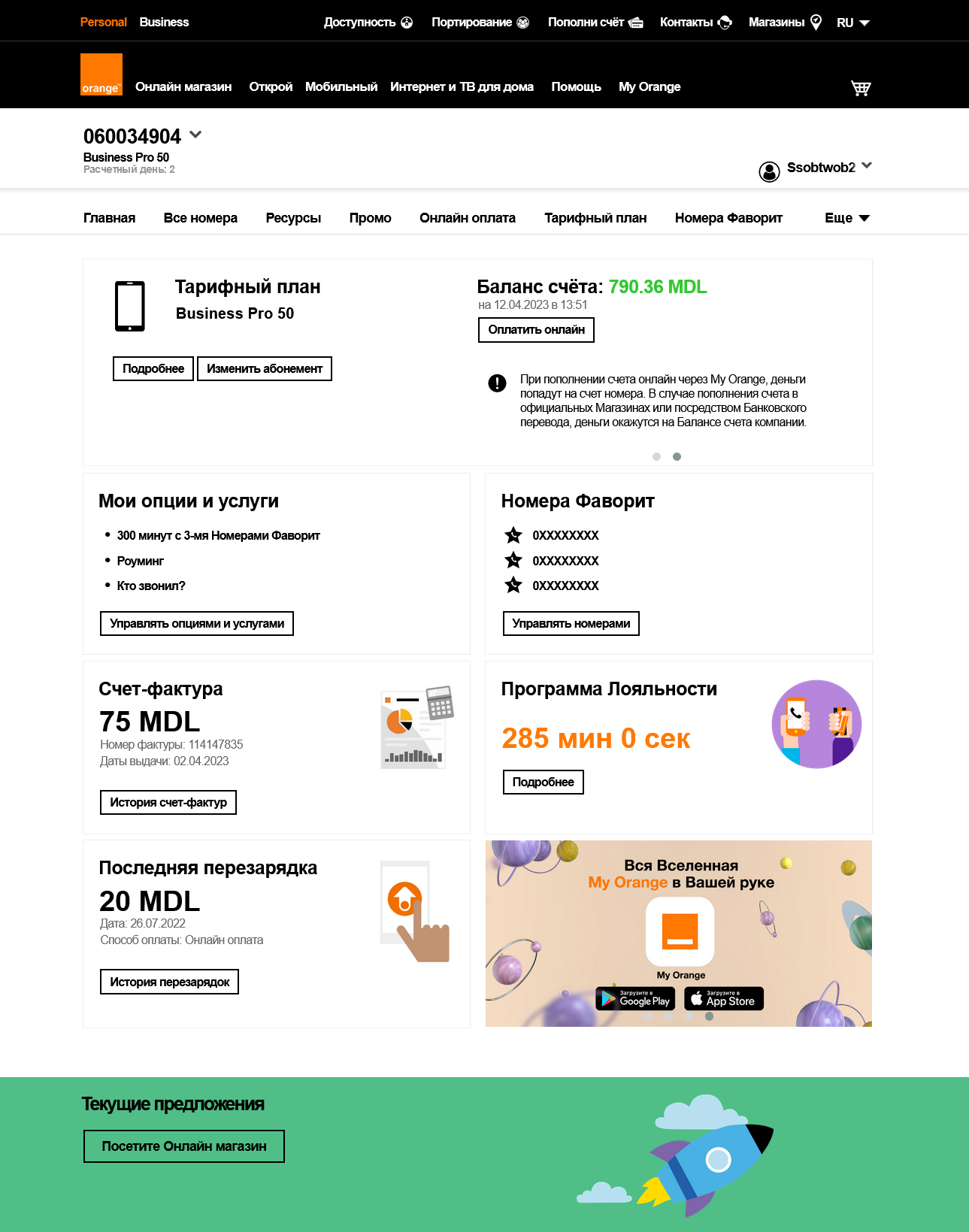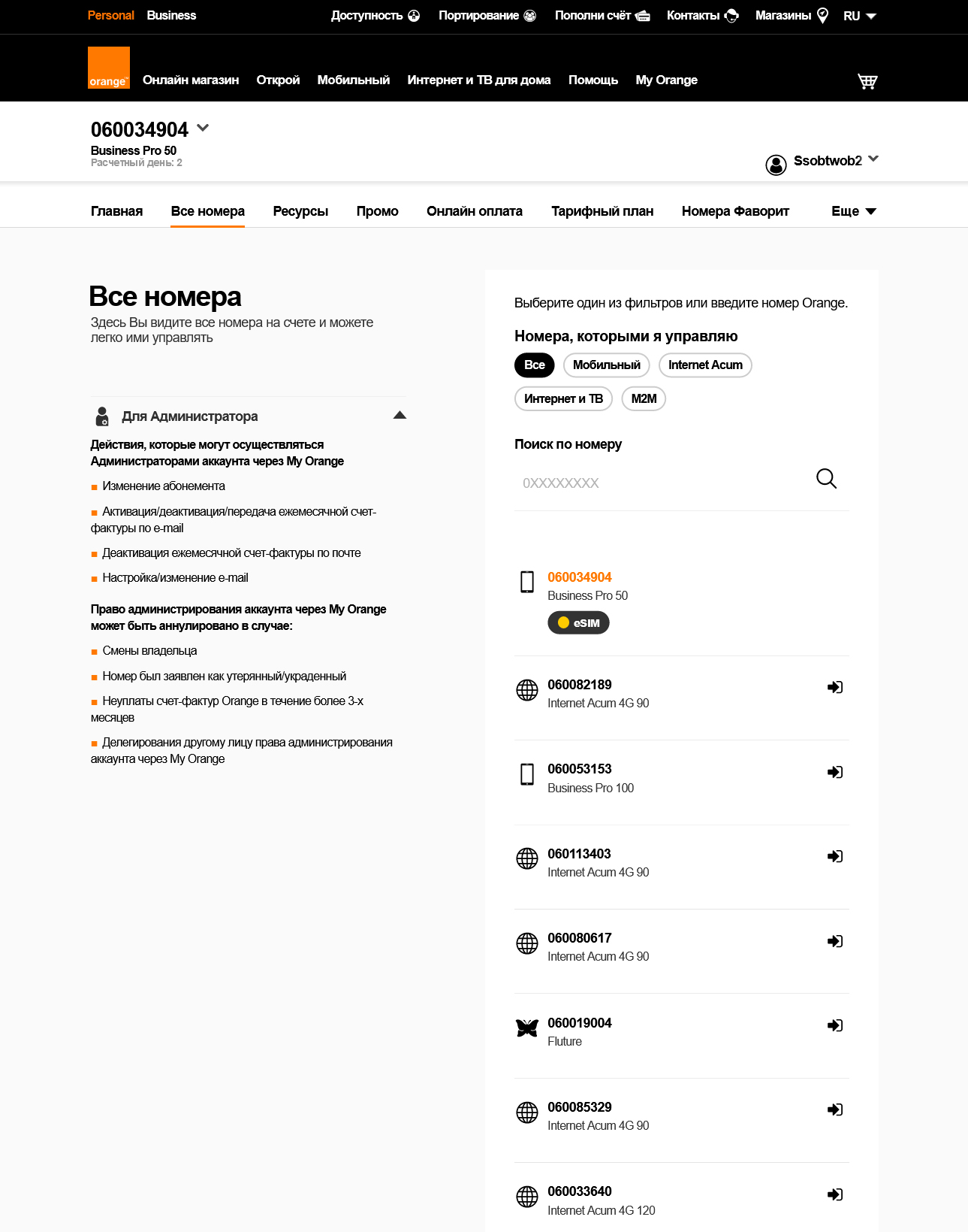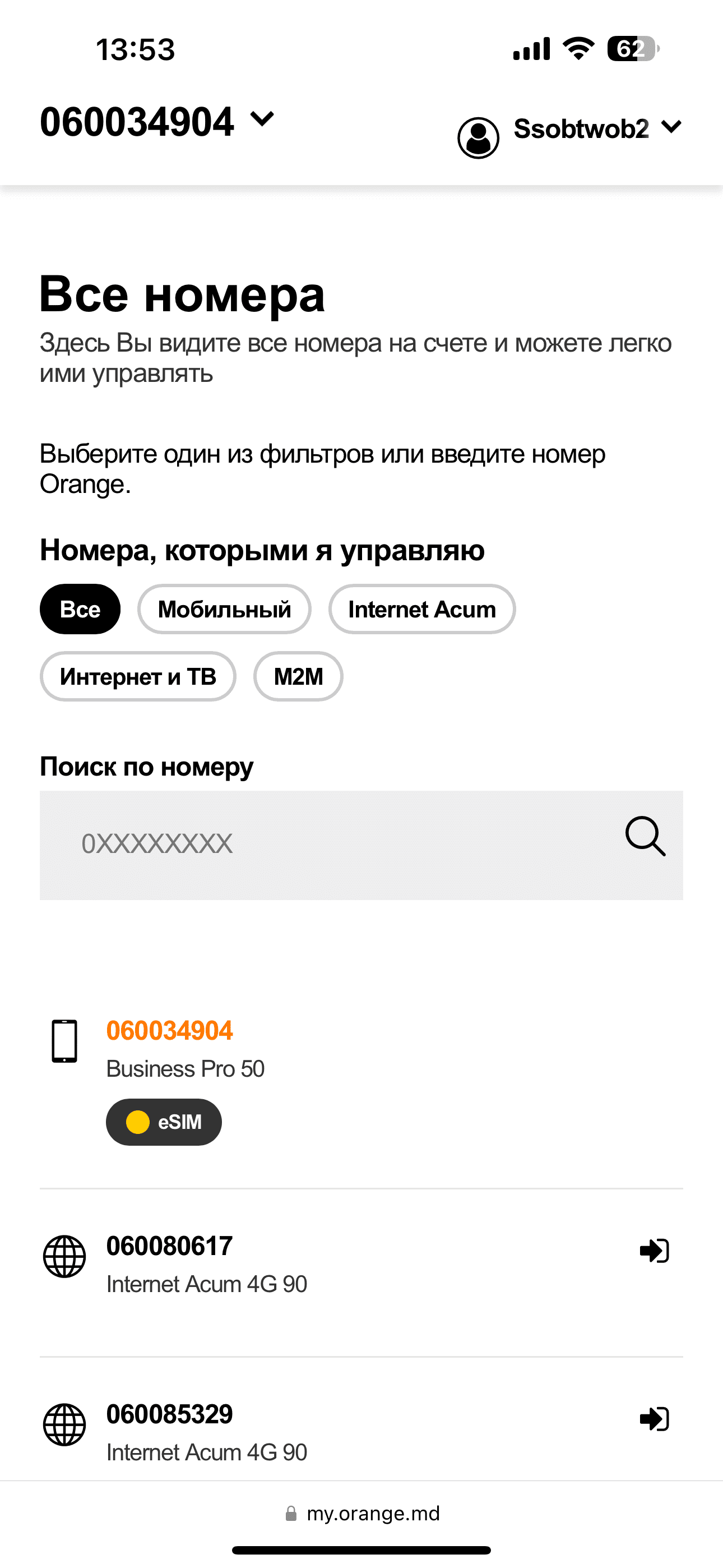 Быстрый доступ ко всем номерам компании — голосовая связь, Интернет Acum, фиксированный Интернет, телевидение и M2M — прямо из аккаунта my.orange.md.