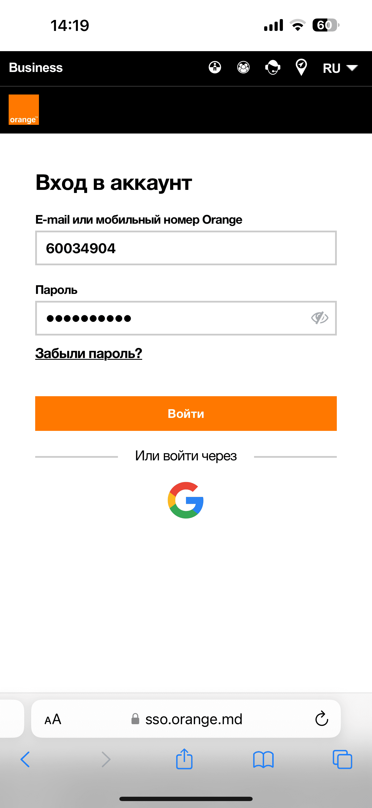 Если у вас уже есть Orange-аккаунт, созданный ранее на ваш служебный номер, введите email и пароль. Если аккаунта нет — его нужно будет создать.
