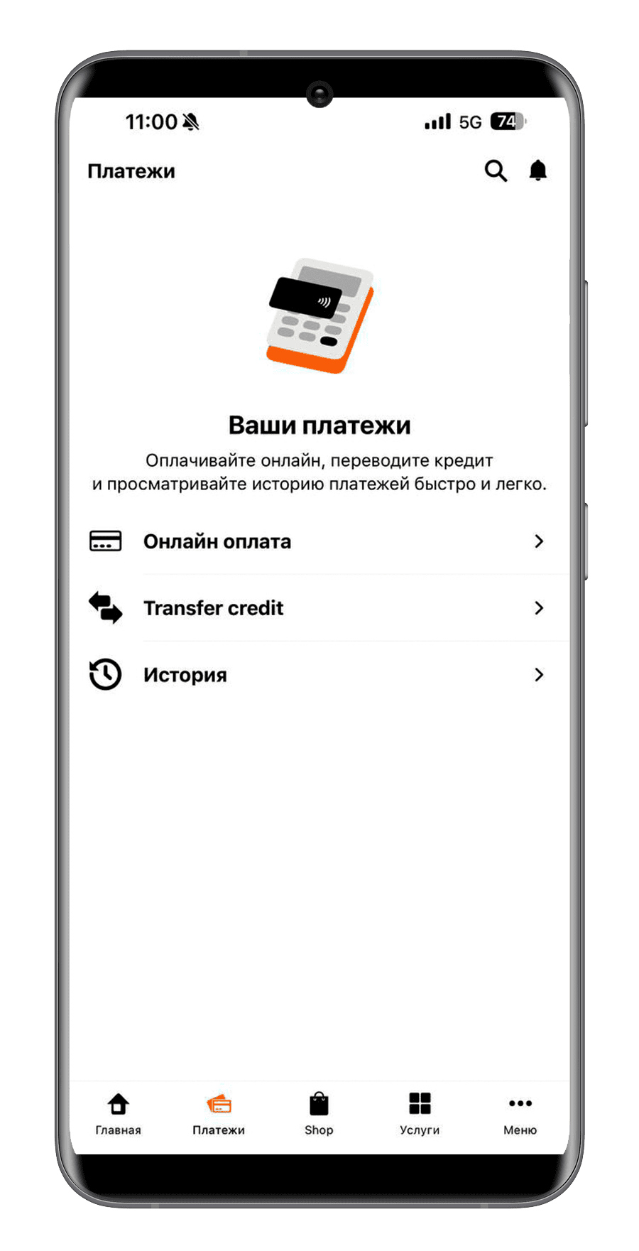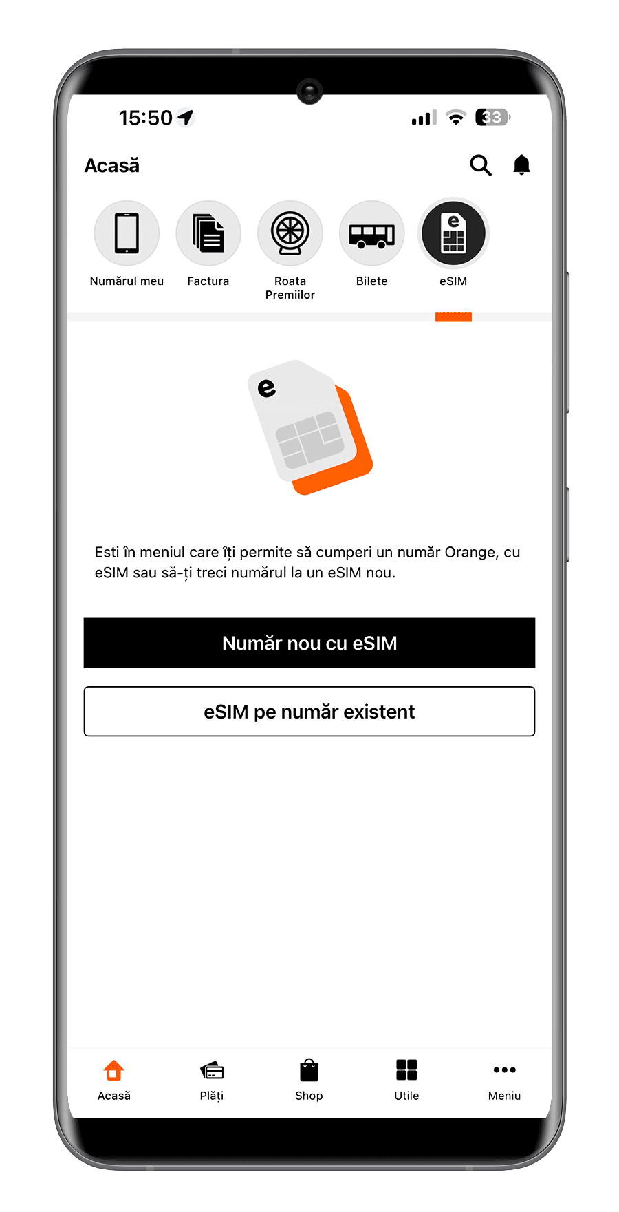Купите онлайн, прямо из приложения, eSIM PrePay, eSIM Абонемент или eSIM Diapora с новым номером.