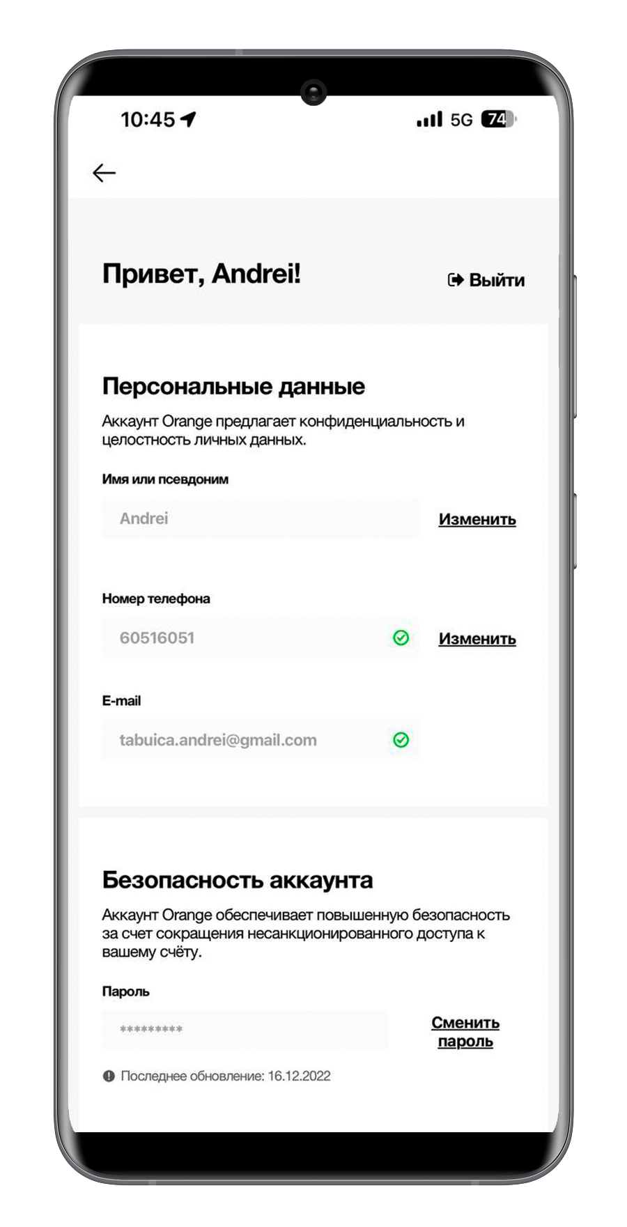 Вы можете изменить отображаемое имя, номер телефона и пароль своей учетной записи Orange в любое время прямо из приложения.