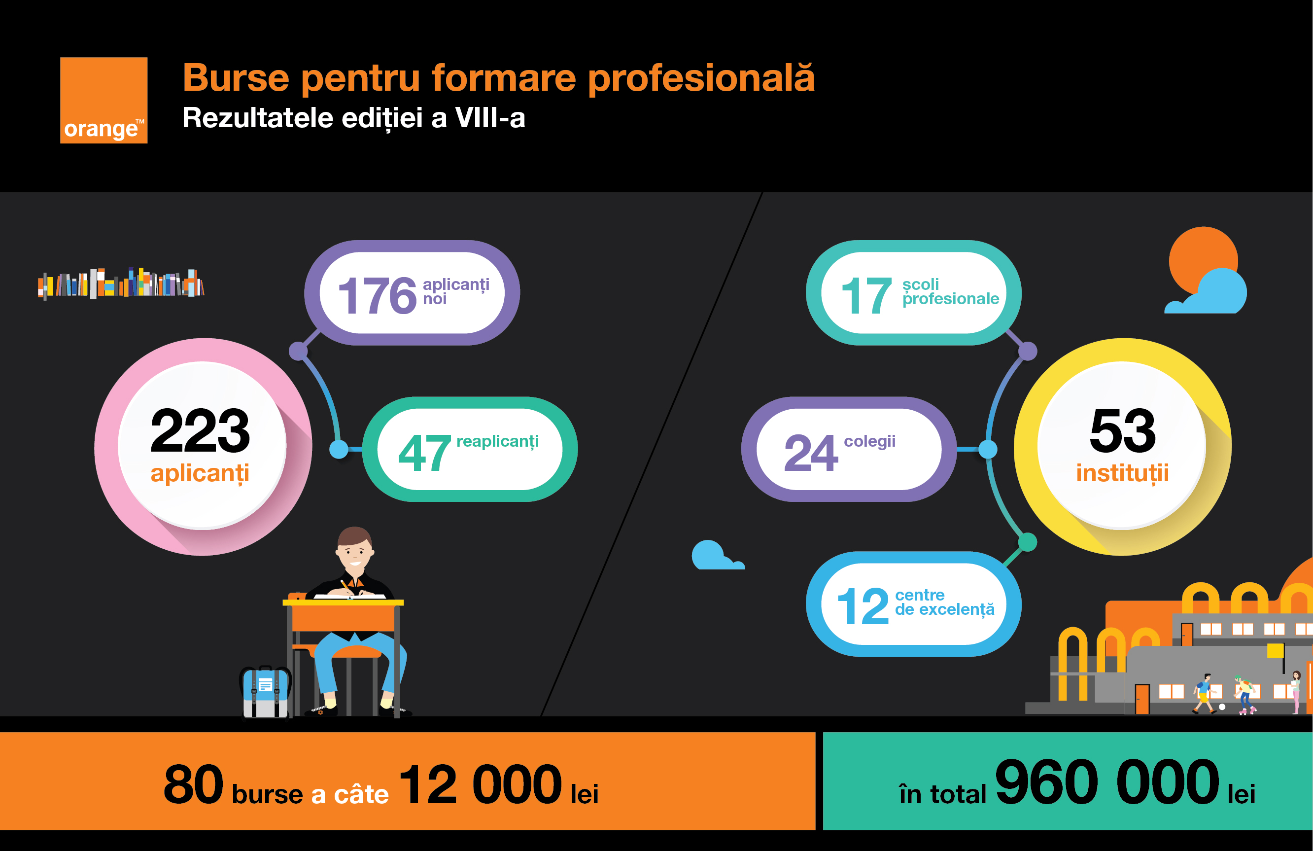 Anul acesta au aplicat la concurs 223 de tineri, din 53 de instituții de învățământ. Astfel, Fundaţia Orange Moldova a oferit, în bază de concurs, 80 de burse, în valoare de 12000 lei fiecare, pentru ca tinerii să-şi poată acoperi cheltuielile legate de studii, dar şi cele curente: cazare, masă, rechizite necesare pentru exersarea viitoarei meserii, etc. Bursele sunt oferite pentru o perioada de 10 luni, cu posibilitatea reînnoirii în următorul an de studii.