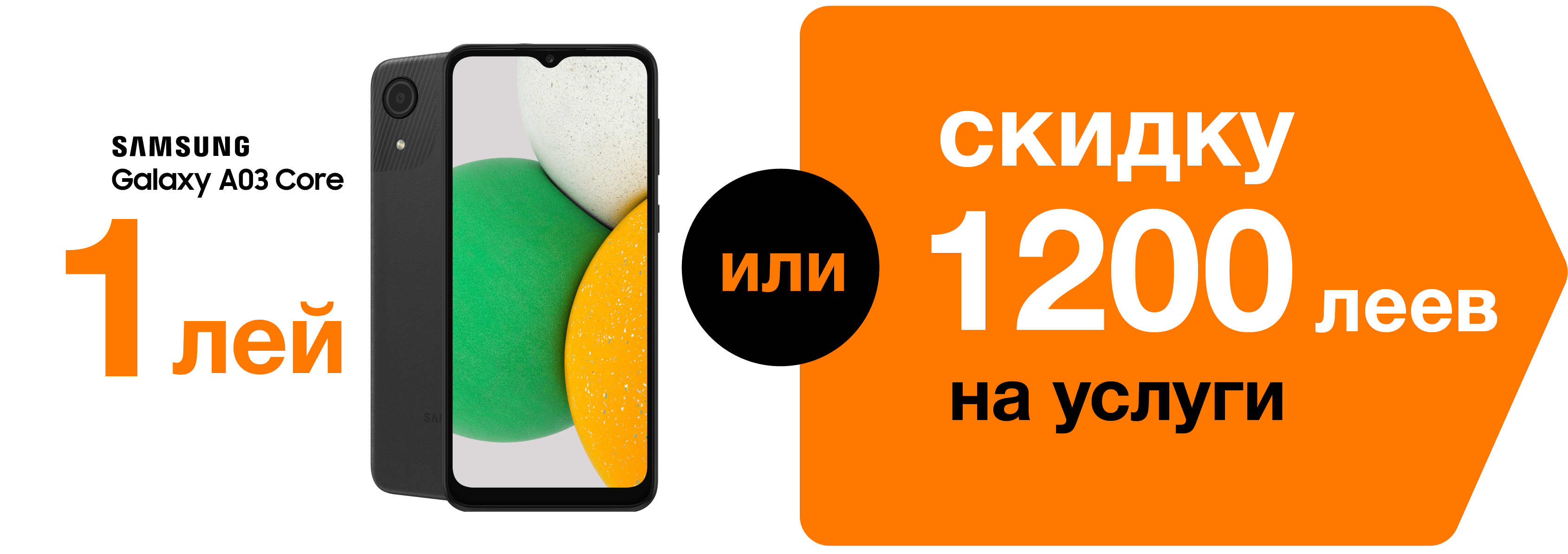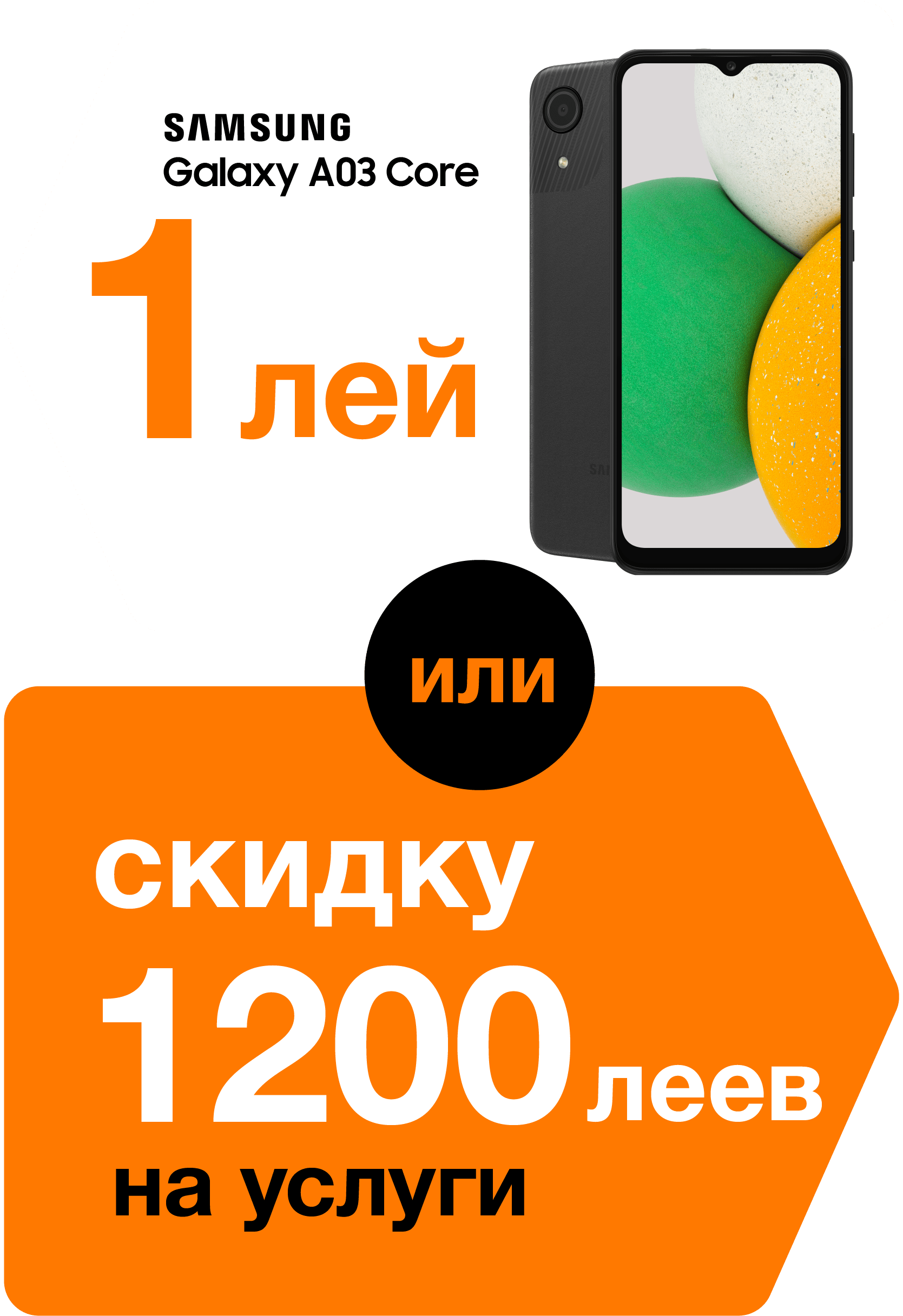 Подключите абонемент Fibră + TV Acasă и выберите предложение. Вы можете приобрести смартфон Samsung Galaxy A03 Core всего за 1 лей для себя или кого-то из близких. Или можете выбрать скидку на услуги на период 2 года в размере 1200 леев, то есть ежемесячную скидку 50 леев, независимо от абонемента, который Вы подключаете.