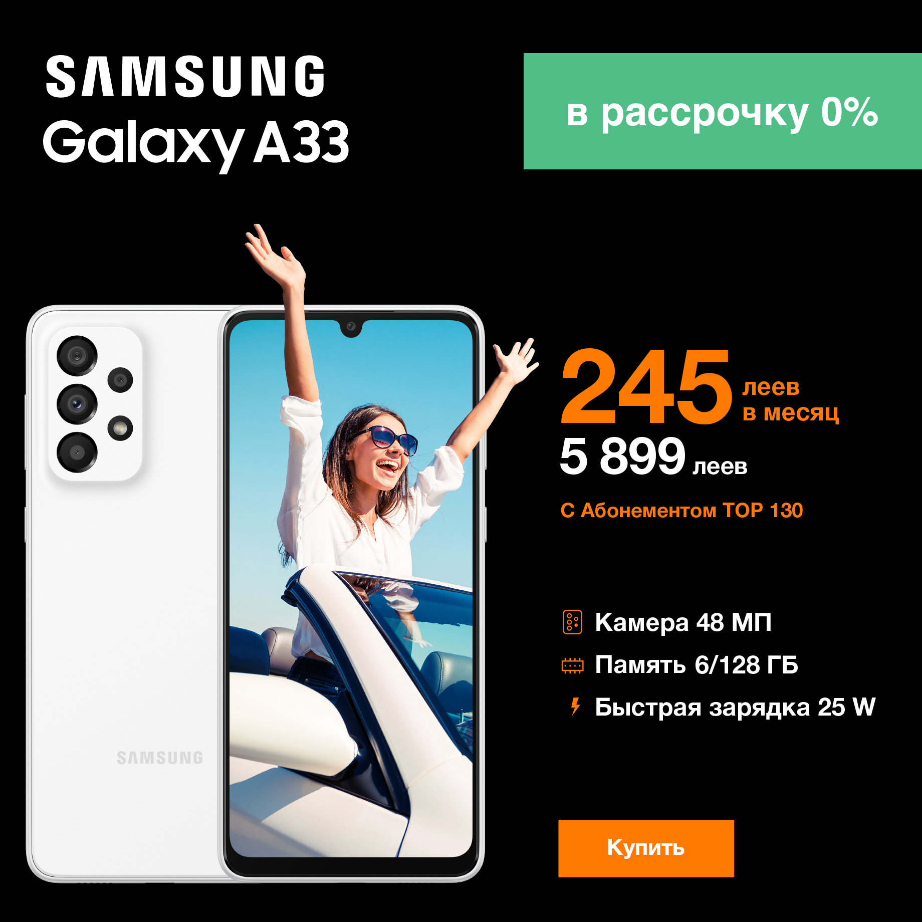 Выберите Samsung Galaxy A33 с экраном Super Amoled и памятью 6/128 GB сейчас всего за 5899 леев или в рассрочку за 245 леев в месяц.