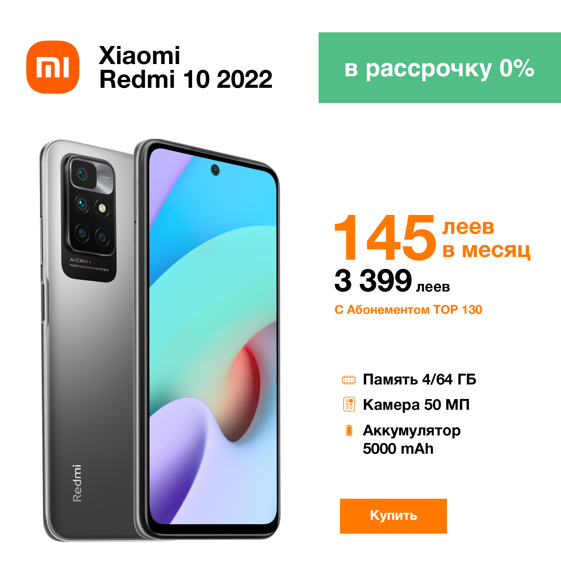 Или приобретите Xiaomi Redmi 10, модель 2022 года, с 4 камерами и большим экраном, теперь в рамках Oferta HIT всего 3399 леев или 145 лей в месяц.