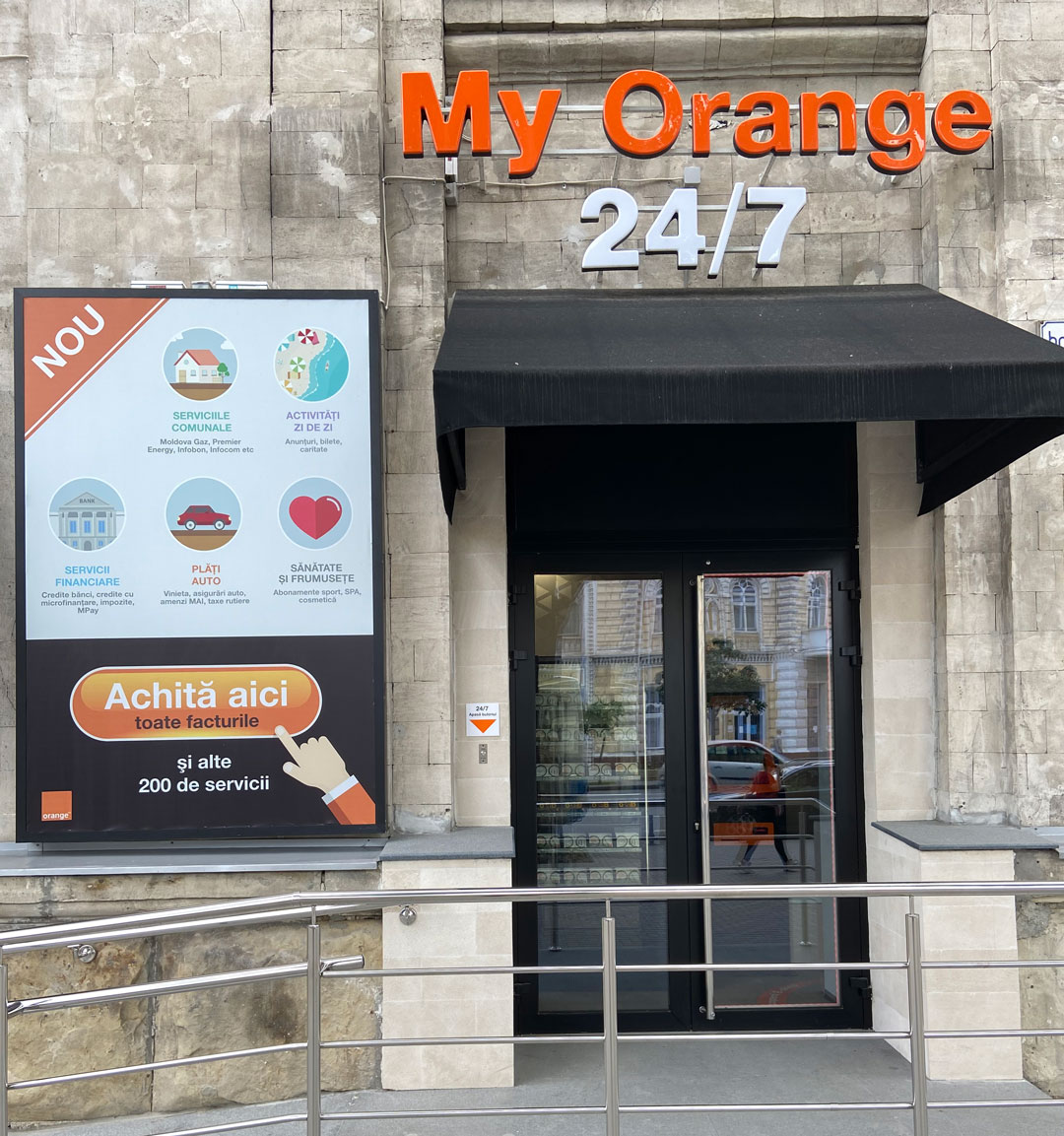 Orange 24/7 это пространство самообслуживания, обустроенное прямо рядом с центральным магазином Orange по адресу Штефан чел Маре,134. Оно работает 24 часа в сутки, а чтобы зайти необходимо нажать на кнопку и дверь откроется.