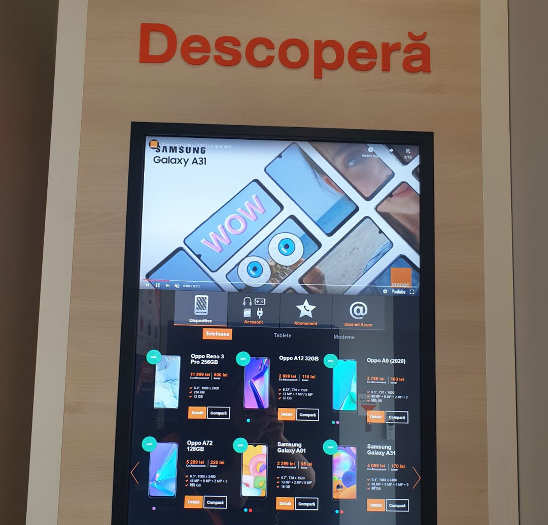 Здесь же находится интерактивный экран, на котором можно увидеть все товары, находящиеся в магазинах Orange. Прочитайте характеристики, узнайте цену, доступные цвета, а так же ближайший магазин, в котором Вы можете приобрести товар.