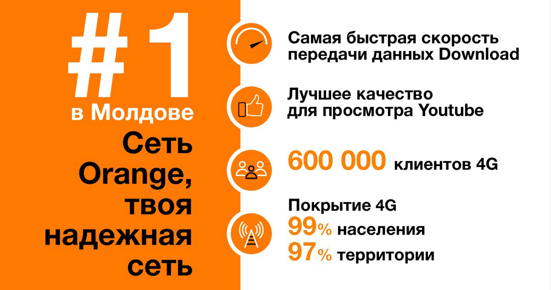 По мнению экспертов, у компании Orange Moldova самая производительная сеть 4G с точки зрения скорости скачивания и самая высокая оценка за услуги передачи данных. Проверка и тестирование также отметили самые лучшие возможности для клиентов компании Orange при просмотре веб-страниц.