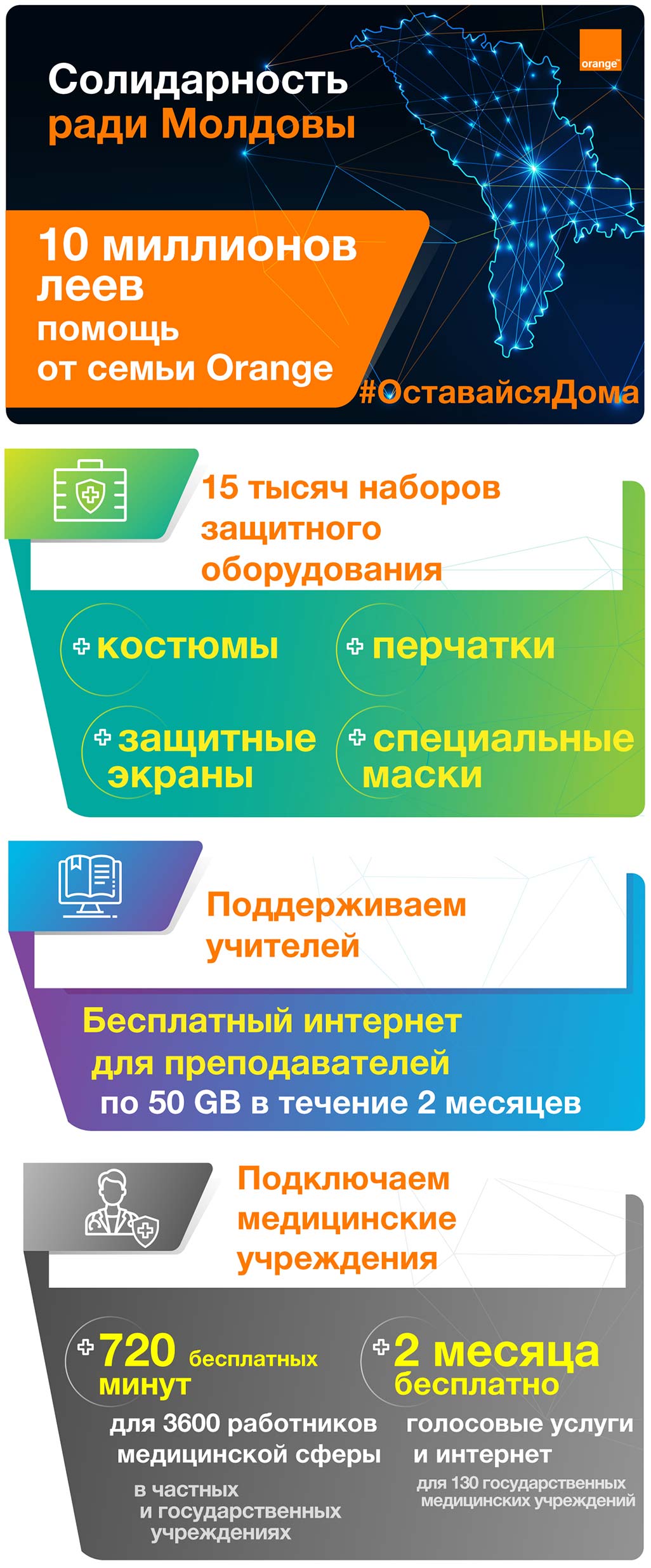 Orange Moldova солидарна с усилиями, прилагаемыми властями и обществом и активно принимает участие в предотвращении глобальной пандемии с максимальной ответственностью перед сотрудниками, клиентами, деловой средой, медицинской и образовательной системами.